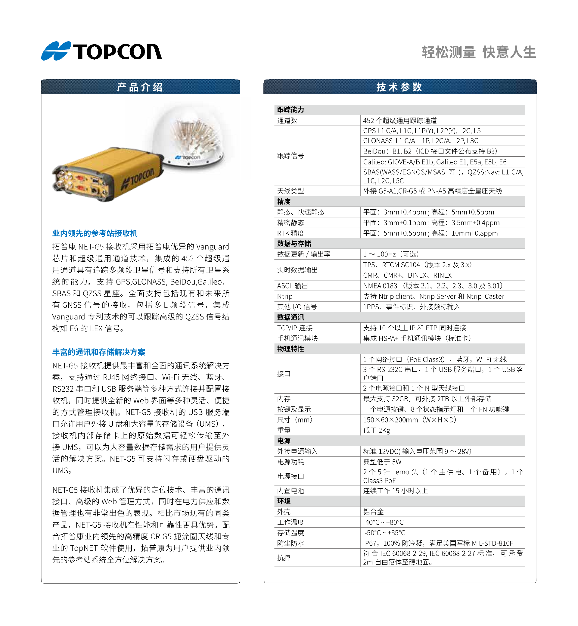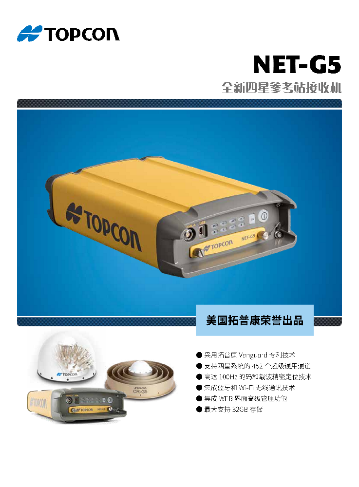 NET-G5接收機采用拓普康優異的Vanguard芯片和超級通用通道技術,豐富的端口設計,集成藍牙和WiFi無線通訊技術,廣泛應用于國家級和省市級參考站網絡建設。